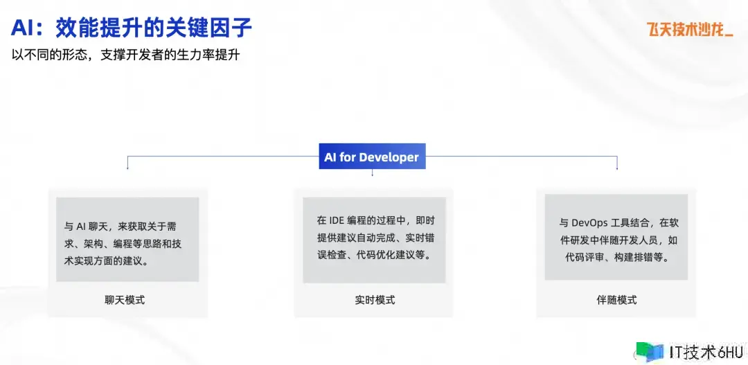 榜首,是对个体功率的提高。 例如咱们能够选用相似 AI 的智能代码帮手,它能够大幅的代替研制人员的重复性作业、简略性作业。咱们以为它是一种 Copilot 的形式,辅佐各个人物去提高自己的作业功率。