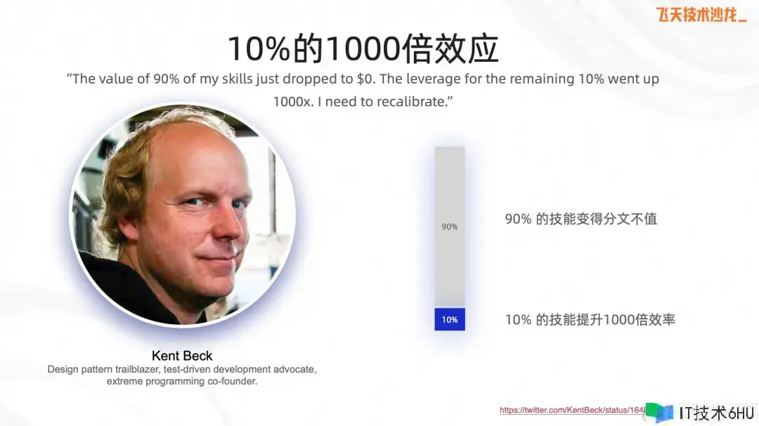 这位美国的 KOL,他也有同样的观念。他以为在大模型年代,或许有许多的技能会被代替,咱们 10% 的技能会被 1000 倍的提高,这个跟咱们的观念是相似的,尤其是在大模型年代,大模型能够许多地代替开发者的日常事务性作业,这部分的占比很或许超越70%,让开发者得以聚集于剩下 30% 的事务和技能的创新。