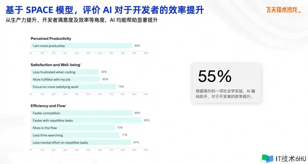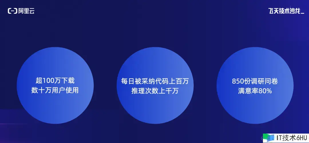 这张图也是微软针对 Github Copilot 用户发放的一份调研问卷,了解他们运用相似 AIGC 的代码帮手对整个的研制功率或许说研制体感有多少提高,能够看到有许多指标都是 80% 以上的,或许挨近 80%。其实咱们也针对通义灵码的运用者发放过相似的调研问卷。有超越 80% 的用户都感觉到运用东西今后生产力有了大幅的提高, 跟这个调研陈述也十分吻合。