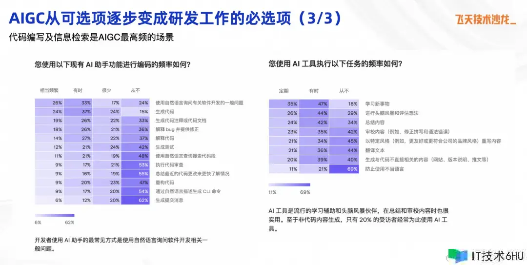 有以下几个:榜首个是运用自然言语去询问软件开发的一些问题,包含生成代码、生成代码注释、解释代码、生成测验等等。其实咱们能够发现这一个调研的结果跟上一个其实是十分吻合的。也便是说在咱们最高频的场景下,AIGC 其实能起到十分关键的作用。 这也是为什么代码智能生成东西现已逐步成为了每个企业有必要选用的一项产品的原因。