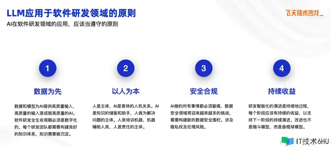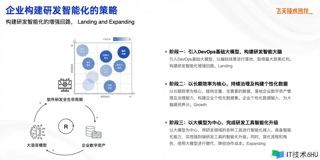 从阶段一、阶段二到阶段三,按部就班的这种形式是咱们比较引荐的。现在一般企业都有全体的软件研制的全生命周期办理的东西链,也有沉积出来的企业十分好的一些数字财物。将数字财物跟大模型结合,进一步去赋能东西链,然后东西链又能够正向地发生更多的财物,因而形成一个循环,让效能越来越高,这便是咱们期待的一个形式。