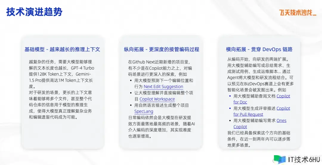 第三个是咱们以为现在现已在逐步的向横向扩展,也便是说会贯穿到 DevOps 的整个链路。比方能够用大模型进行辅佐的文档查阅、生成评定、辅佐编写,大模型现已开端逐步渗透到软件工程的各个范畴。