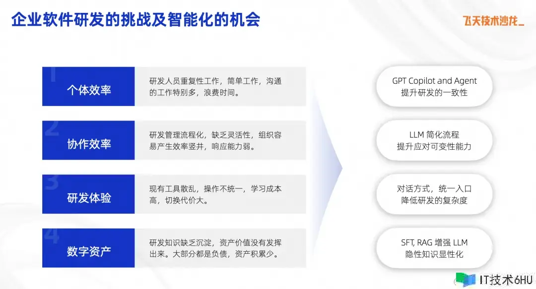 在曩昔的若干年,为什么软件效能或许说研制功率提高十分困难,便是由于这些维度没有得到十分好的处理。今日在大模型年代,经过 AI 逐步地去代替人类的事务性作业后,它能够起到十分大的改善作用。咱们总结下来有以下四大方面。