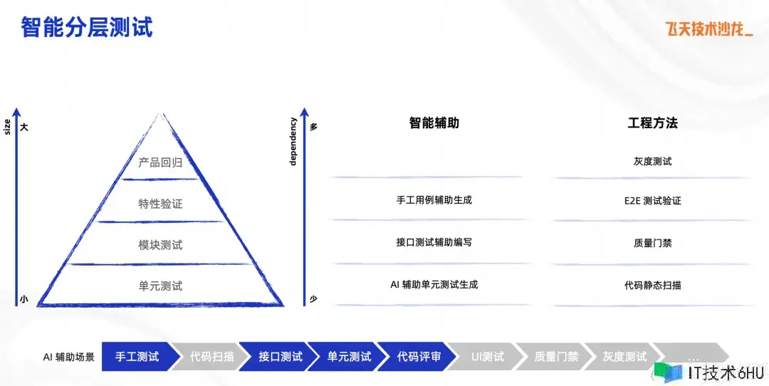 也能够进行智能的分层测验,根据需求主动生成手工用例,主动的生成接口测验,生成单元测验,做代码评定,这些都能够做。然后像图上蓝色部分,咱们也有一些技能计划能够在现阶段大模型的技能基础上落地。