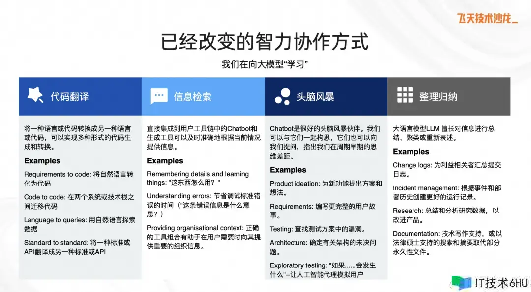 第四个是大模型十分拿手的收拾概括。 咱们能够用它来收拾咱们的需求、收拾文档和常识,这四种形式实际上现已在改动咱们的智力协作形式。