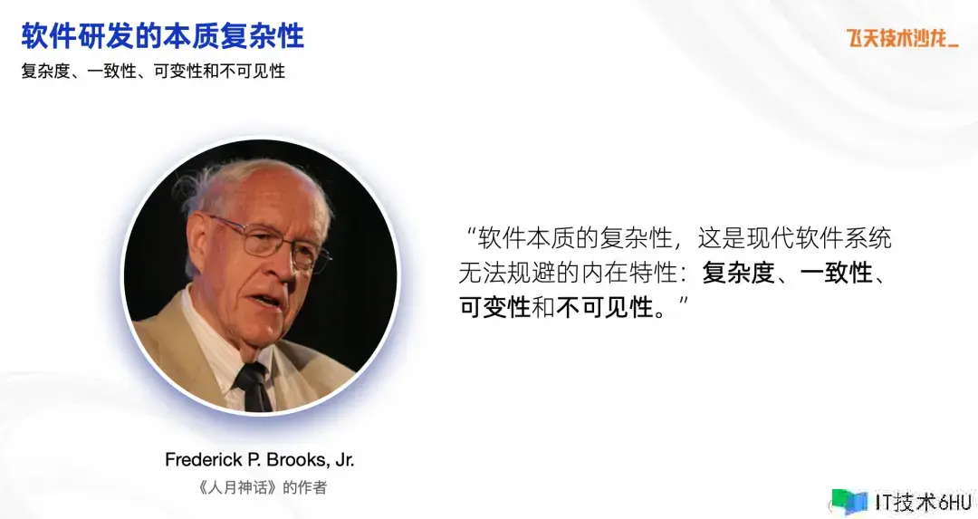 在 2023 年 6 月,咱们组织过一次大规模的专家研讨会,在这个研讨会上咱们都在评论智能化未来对软件研制或许软件工程范畴的深刻影响。在这个会上,咱们有位专家提出了一个观念,他以为软件工程是人类历史上榜首次大规模的集体智力的协作活动,它本身是有实质的杂乱性在的。例如《人月神话》的作者所讲的,他以为软件实质的杂乱性是现在软件系统中无法规避的内涵特性,比方杂乱度、共同性、可变性和不行见性。