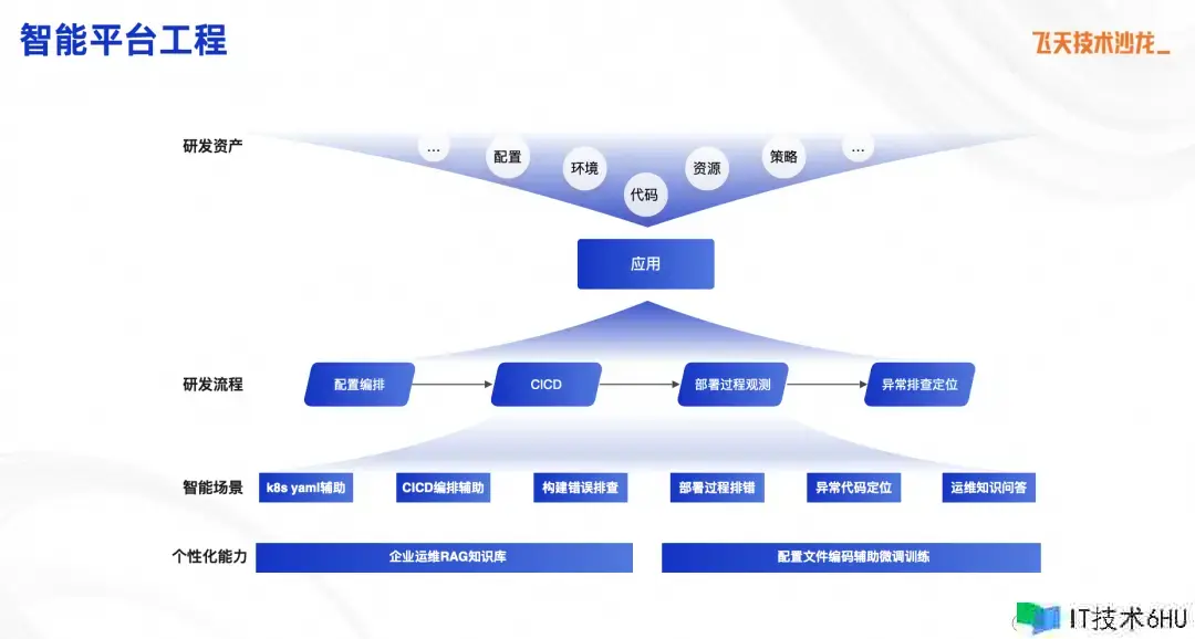咱们也能够做智能化的渠道工程。比方说咱们有一些场景:K8s yaml 的辅佐编写,CICD 的编列辅佐,构建过错排查,布置进程排错,反常代码定位和运维常识问答。终究去完成装备编列→CICD→布置进程观测→反常排查,整个 CICD 主链路的智能化改造,咱们把它叫做智能的渠道工程,这些点咱们都能够在现阶段进行落地了。