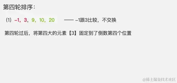 第四轮往后,将第四大的元素位置确定,此时总共5个元素,现已排序好4个,从而最终一个自然而然便是排好序的了