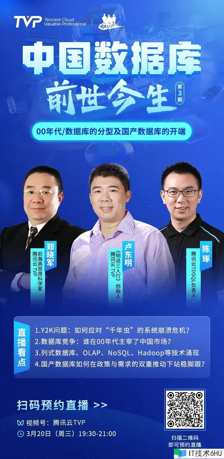 3 月 20 日(本周三)晚上 19:30~21:00,第三期【我国数据库宿世此生】践约而至~ 本次直播,咱们有幸邀请到了《明说三人行》创始人、腾讯云 TVP 卢东明,前瀚高首席科学家、腾讯云 TVP 郑晓军老师,以及腾讯云数据库产品总监、TDSQL 产品负责人 陈琢老师参加对话。细数 00 时代我国数据库的开展历程。