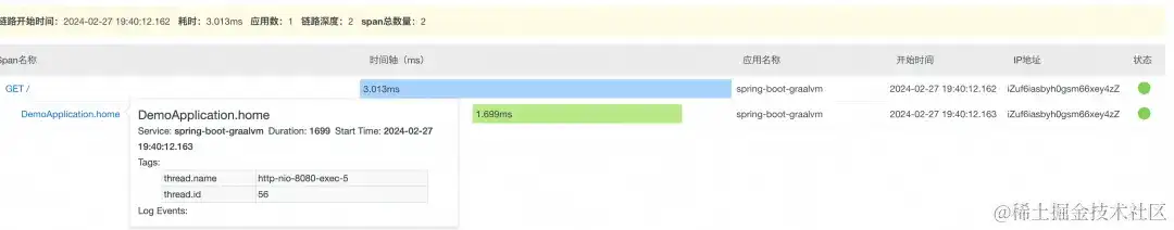 测验进程中同样对使用发了 5 次调用,经过上述作用比照截图能够发现,Spring Boot 使用根据 GraalVM 静态编译后,选用静态插桩技能,所收集的恳求数等指标与 JVM 环境动态增强方法共同,得益于静态编译技能的优化,恳求 Span 耗时(不触及网络状况下)比 JVM 环境增强方法低许多。除了上述 Spring Boot 使用的测验成果,其他的一些常用组件,例如 Kafka、MySQL 和 Redis 都做了上述同样测验,发现计划都是有用的!