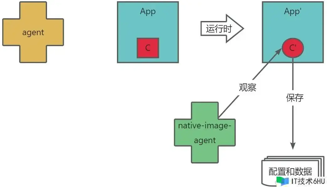 因而,咱们经过对 native-image-agent 进行改写,在原有的基础上添加了对 Agent 完成类改换代码增强行为的调查记载逻辑,完成原理如图 2 所示。图中的黄色 Agent 在原始使用 App 上对赤色的代码 C 实施运转时动态增强,将 C 部分代码转换为 C’,然后得到了 App’。添加了记载代码增强才能的 native-image-agent 担任调查从 C 到 C’ 的进程,将 C 的具体类名保存到配置文件,将改换后的 C’ 保存到磁盘。