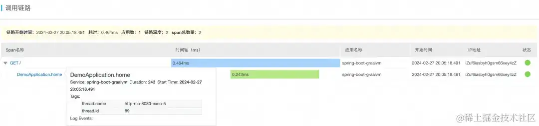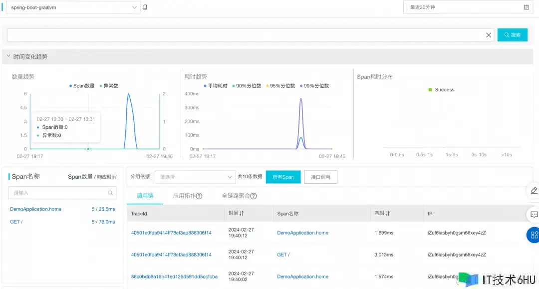 在 GraalVM 静态编译环境下,根据上述计划,然后使用 OT 探针无侵入对 Spring Boot 使用进行可观测数据收集,将数据上签到阿里云使用实时监控服务 ARMS 中的可观测链路 OpenTelemetry 版中的作用如图 6 所示: