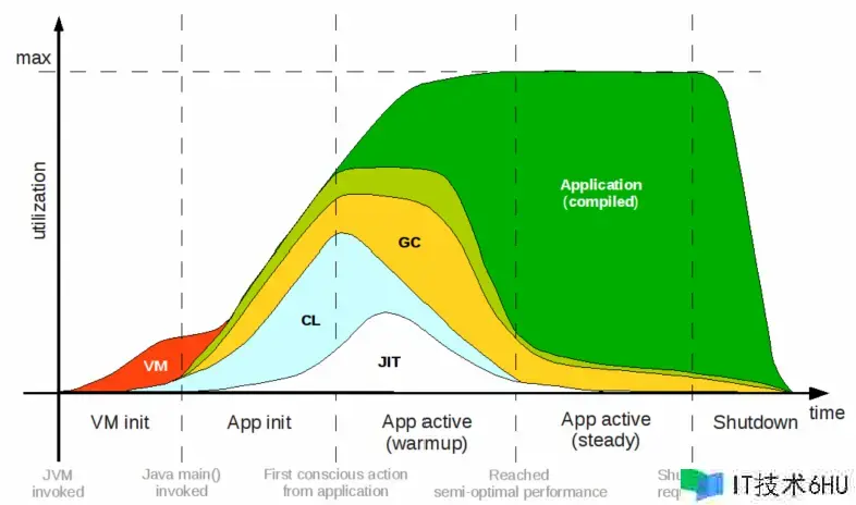 跟着程序运转的深化,JVM 会选用及时编译(Just In Time,JIT)技能对履行频率较高的代码进行编译优化,以便提高使用程序运转速度。JIT 进程对应上图中的白色部分。经过 JIT 编译优化后的代码对应图中深绿色部分。经过上述分析,不难看出,一个 Java 程序从发动到到达被 JIT 动态编译优化会经过 VM init,App init 和 App active 几个阶段,比较于其他一些编译型言语,其冷发动问题比较严重。