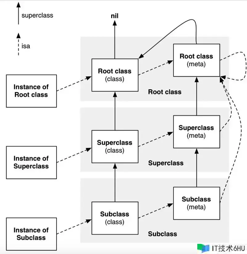 4,元类的 superclass 指向父元类,父元类 superclass 指向的根元类,根元类 superclass 指向根类,根类 superclass 指向nil