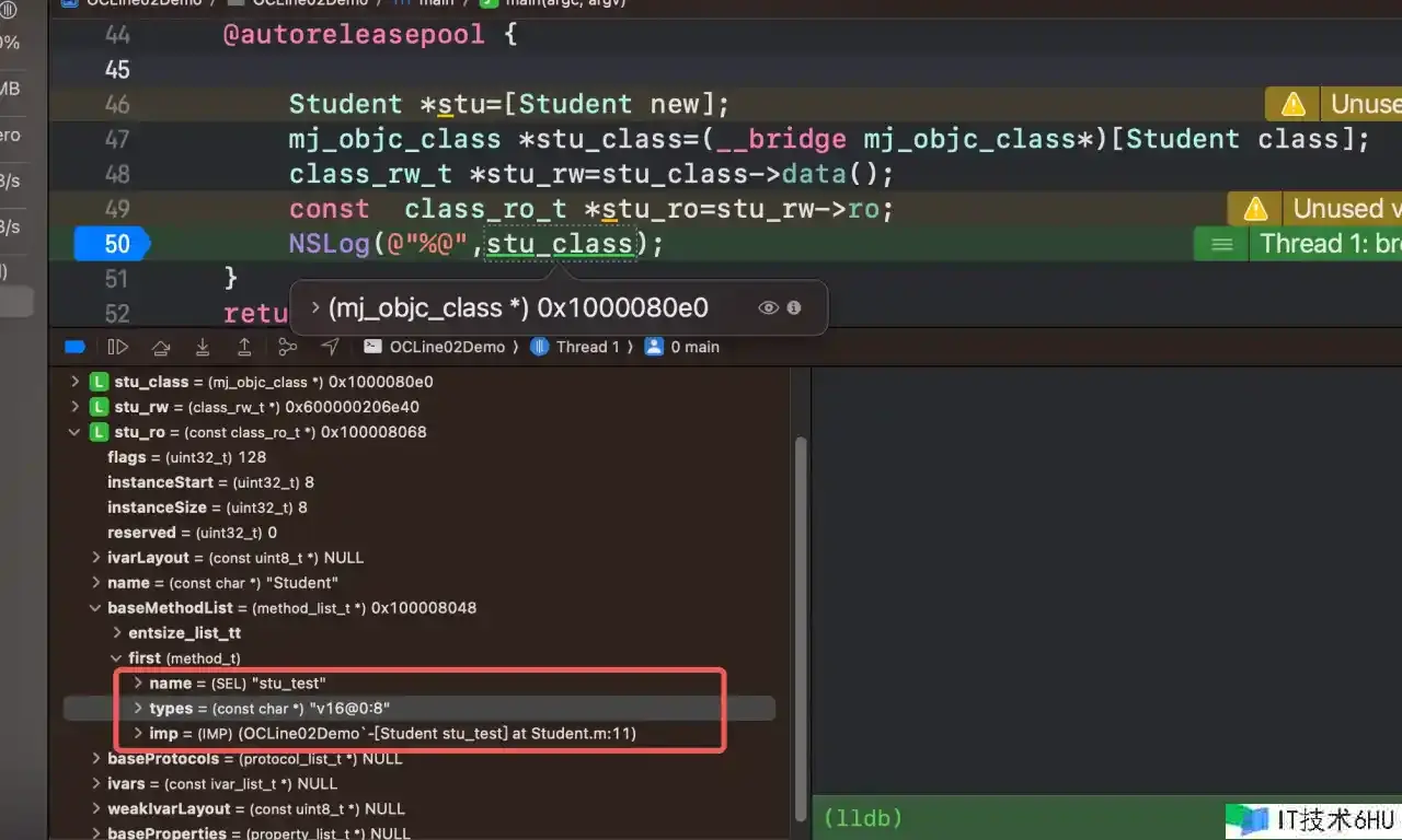 能够看到types在值:v16@0:8 ,能够看出name,types,IMP其实都在class_ro_t结构体中,这样的确证明了之前说的;class_ro_t结构体在运行时存储着类的初始状态数据。