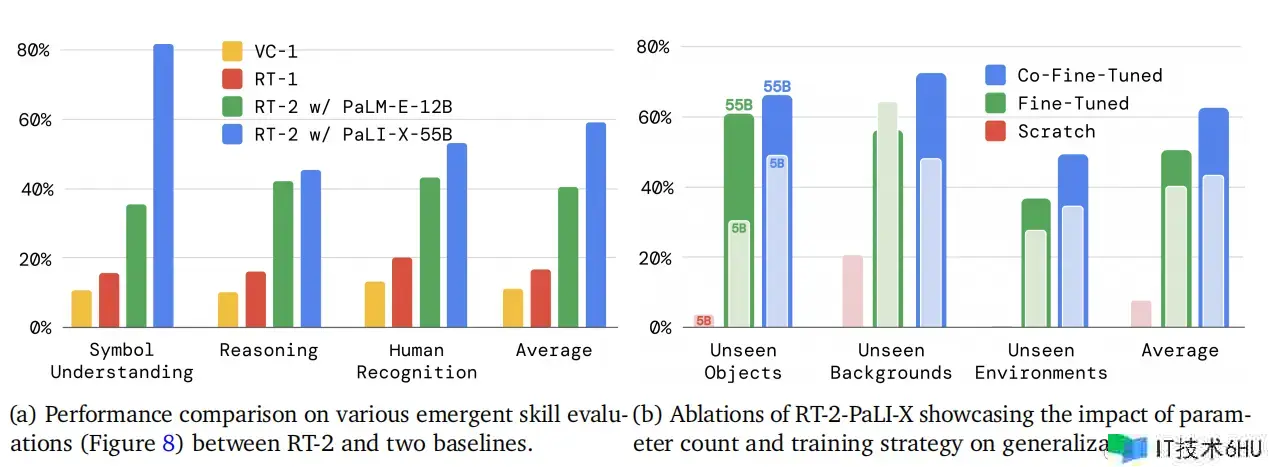 - 在评估新兴能力的实验中,RT-2在符号理解、推理和人类识别任务上显著优于基线模型。