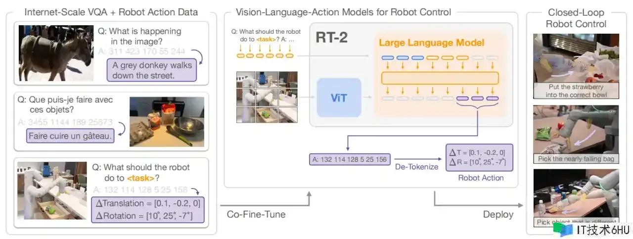 RT-2将预训练的视觉-语言模型(VLMs)进一步训练,使其能够直接控制机器人的动作。这个过程的目标是让模型学会将视觉输入和语言指令映射到具体的机器人动作上,从而实现对机器人的闭环控制。