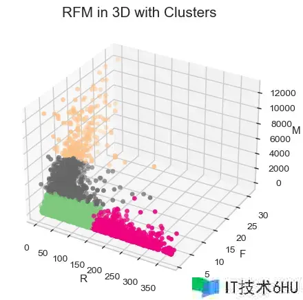ax.scatter3D(df_kmeans.R, df_kmeans.F, df_kmeans.M, c=df_kmeans.clusters, cmap='Accent')