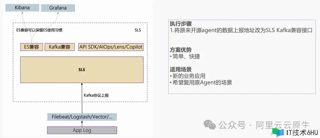 假如是新的事务或许 APP 想要测验 SLS,没有前史包袱。可是又不想在机器上装置 iLogtail。那么能够复用本来的收集 Agent,将收集 Agent 的日志以 Kafka 协议的方法写入到 SLS。参阅运用 Kafka 协议上传日志 [ 5] 。在日志写入 SLS 后,想保存开源运用习气,能够运用 SLS 兼容接口对接 Kibana、Grafana 等可视化东西。