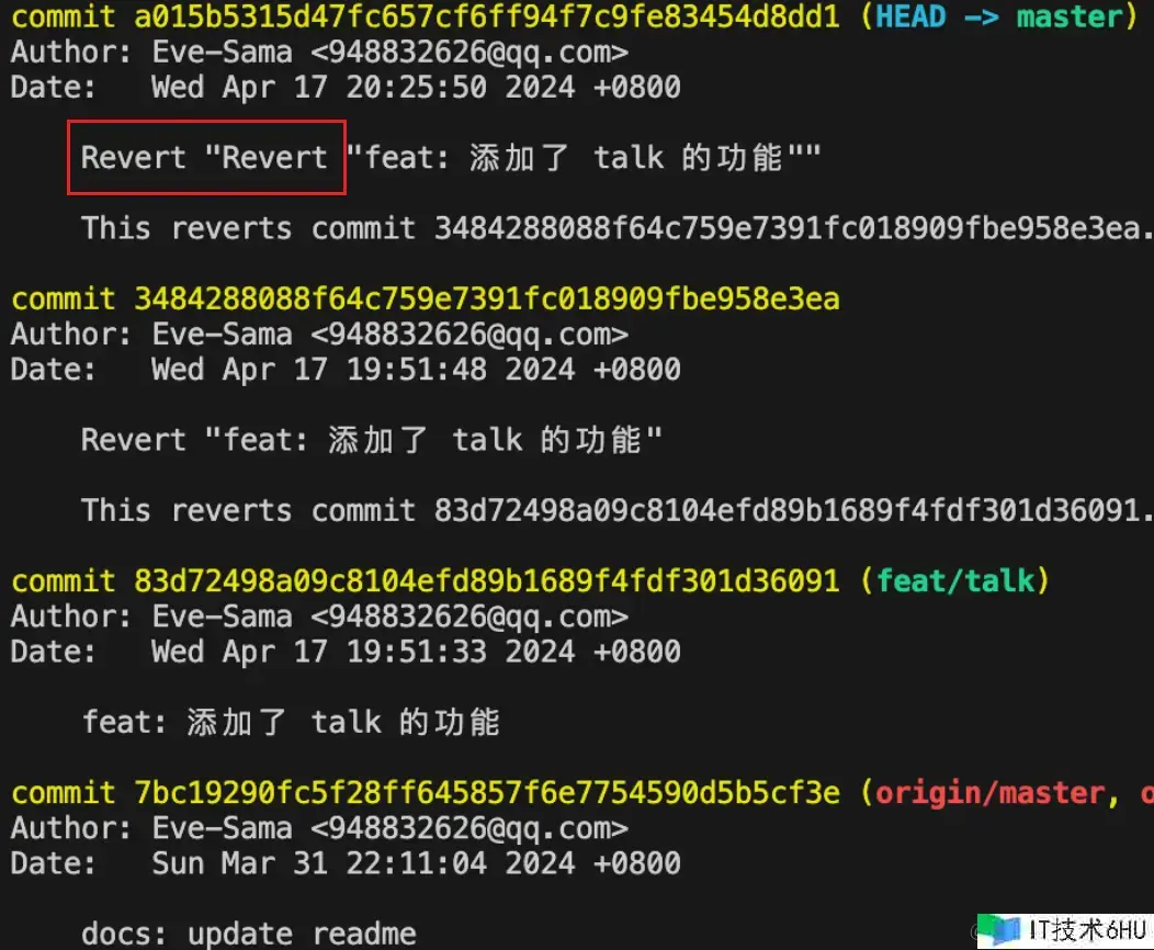 那么当你想在master分支merge feat/talk的时分, 是不是feat/talk有的commit在master都已经有了? 尽管你revert了, 可是也并没有影响他该有的commit还在啊. 所以你merge的时分他认为没有新的commit产生, 也没毛病.