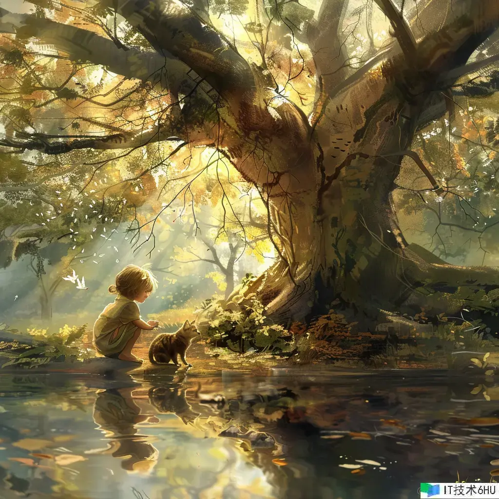 例如:公园的大树下,一个小女子蹲在地上和一只小猫在玩耍,十分实在具有镜头感,高质量的拍摄艺术。