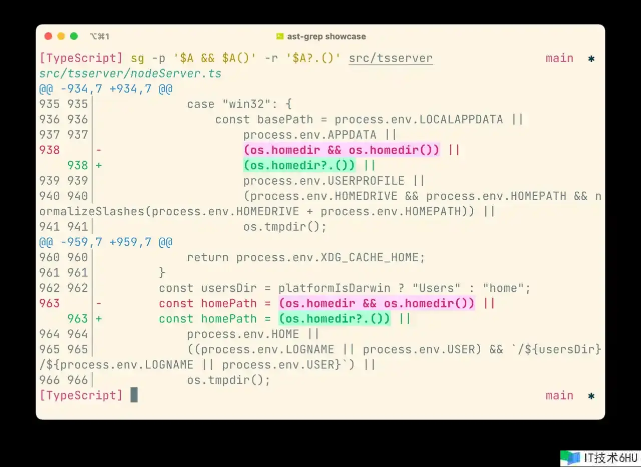 假定你需求将项目中相似os.homedir && os.homedir()的老式安全访问方法改为 ES6 标准的可选链式操作os.homedir?.()。以往你或许需求吃力定位和逐一替换,但现在只需一条 AST-GREP 命令:sg -p '$A && $A()' -r '$A?.()',就可以完结整个项目的重构,如下图所示: